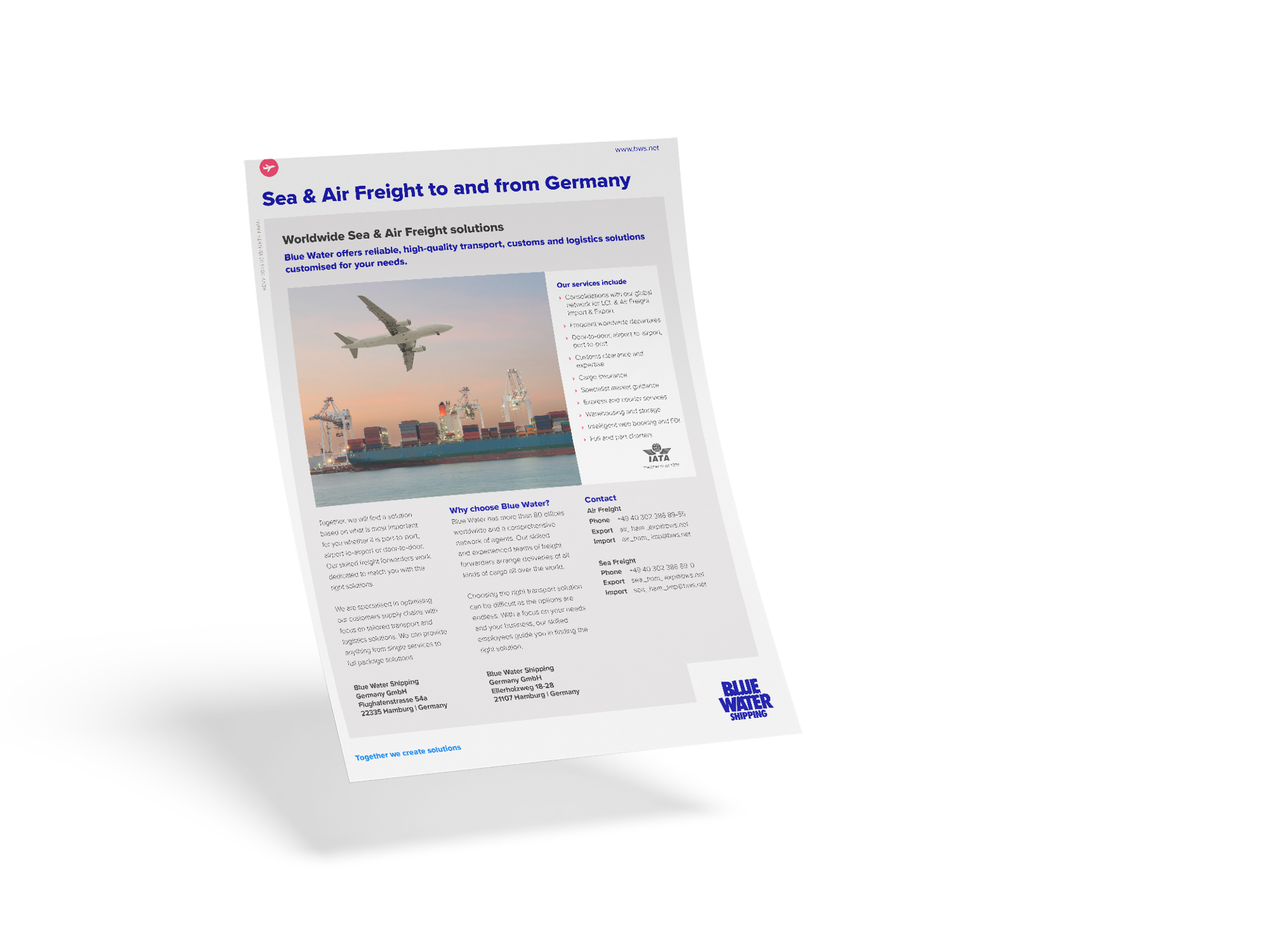 In this way, we ensure safe and efficient freight forwarding for our customers. Blue Water Germany's professional employees are an active part of our international network. We serve German export and import companies in all modes of transport, in all directions.