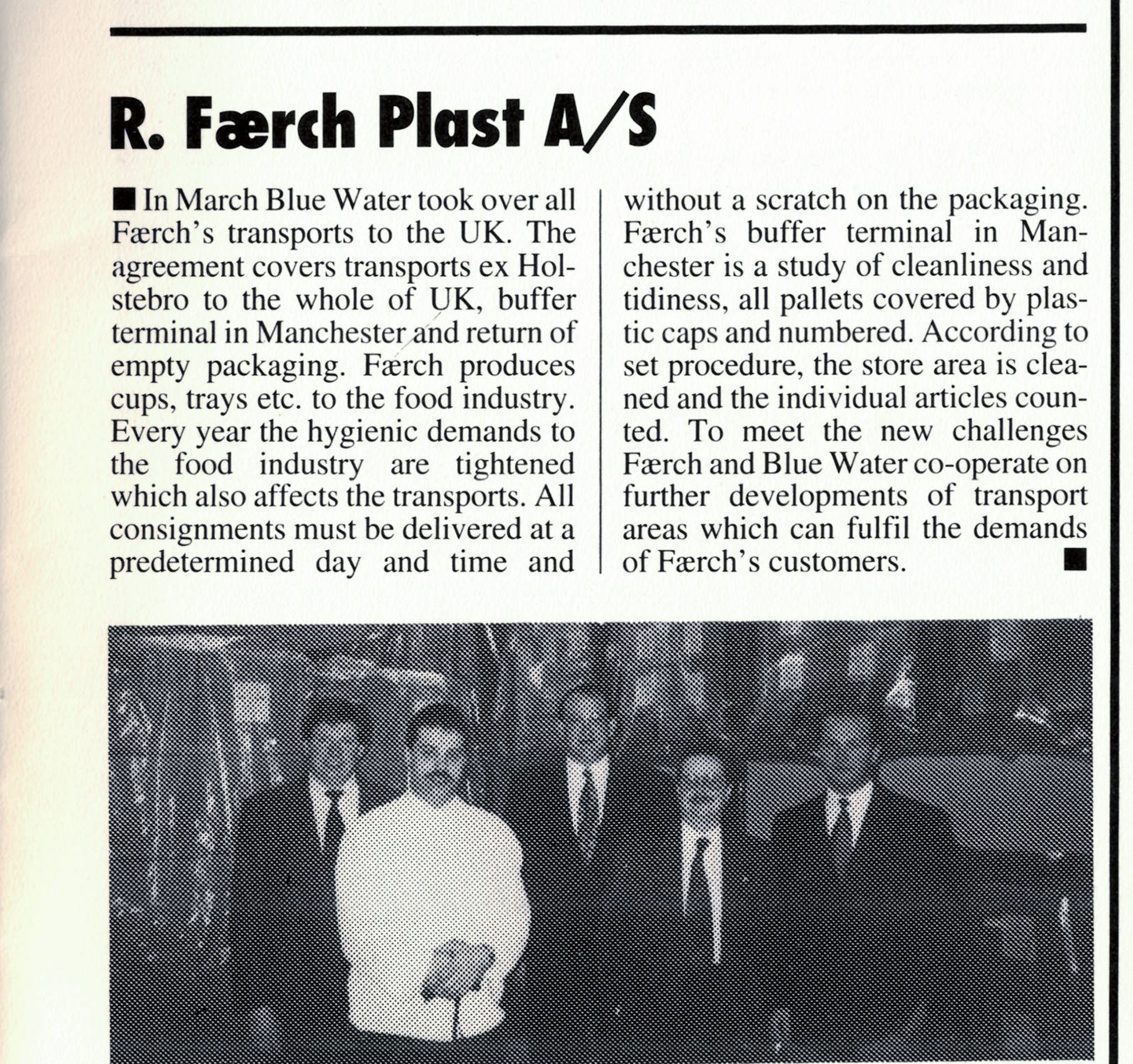 På 1990-talet upplevde Faerch en betydande ökning av exporten till Storbritannien. För att möta den växande efterfrågan tog Blue Water steget fram som en pålitlig leverantör av vägtransporter. Under åren, när Faerch expanderade sin verksamhet i Storbritannien och öppnade tre produktionsanläggningar för att komma närmare kunderna och öka leveranshastigheten, säkerställde Blue Waters team i Manchester smidiga transportoperationer. Idag hanterar Blue Water över 250 000 pallar årligen för Faerch, endast mellan Danmark och Storbritannien samt inom Storbritannien.