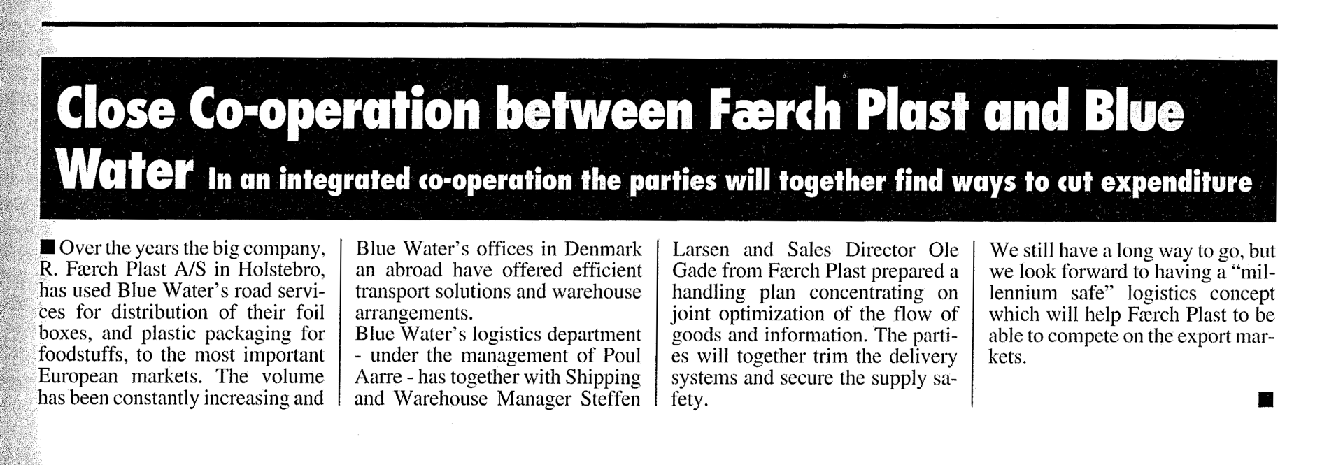 "Under de senaste 30 åren har Faerch har varit på en fantastisk resa med Blue Water och vi är oerhört tacksamma för det enastående stöd och engagemang vi ständigt har fått – både vid leveranser till våra kunder och när vi expanderat vår verksamhet till nya geografiska områden. Vi har alltid känt oss som viktiga kunder tack vare Blue Waters orubbliga engagemang för att lösa problem, hitta lösningar och agera beslutsamt, som under Brexit och pandemin. Detta är inte minst tack vare Blue Waters team i Holstebro och Esbjerg samt Kurt Skov, som alltid hållit ett vakande öga på Faerch och säkerställt att våra behov uppfylls," säger Tom Sand-Kristensen, CFO på Faerch.